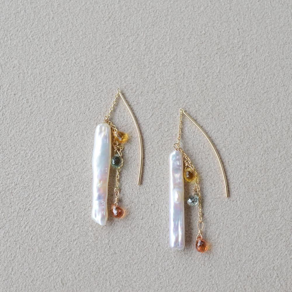 繊細な輝きを放つスティック型の淡水真珠に、優美な色彩のファンシーサファイアをあしらった、大人のためのエレガントピアス。