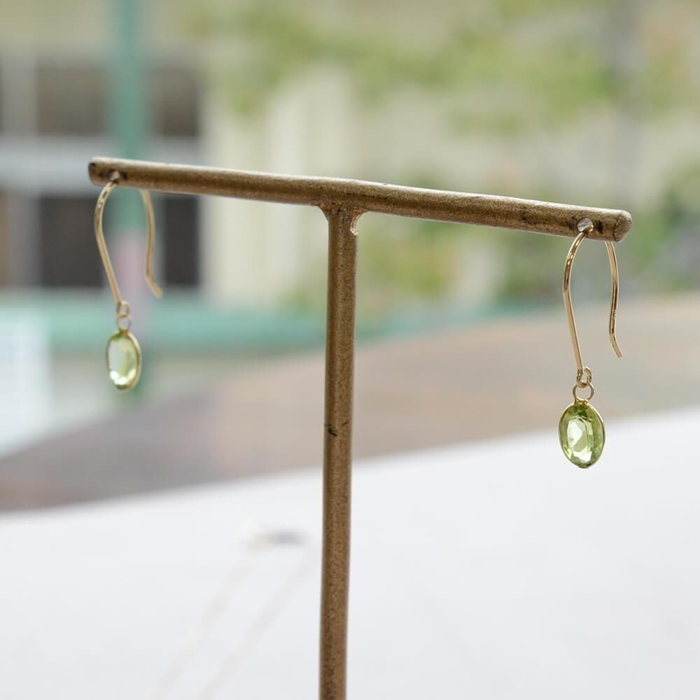 深みのあるグリーンが印象的な天然石ペリドットを、18金(K18)ゴールドの滑らかなラインにあしらったフックピアス。